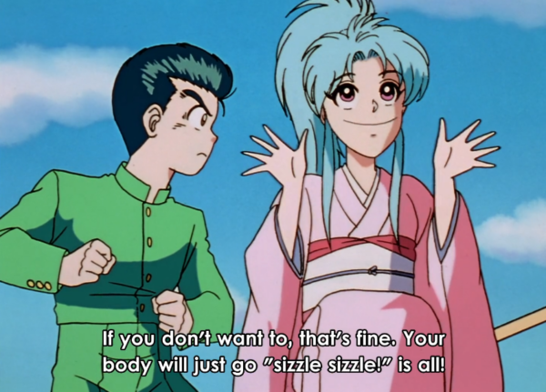 Something that’s pretty much been lost over the years and was heavily used in DBZ is the term “saga.” Used to describe a group of arcs that connected together to tell a certain portion of the story. Yu Yu Hakusho has multiple arcs that span four major sagas. The first one, Spirit Detective Saga, was good enough to introduce the characters and the world. I’d be lying if I said it wasn’t the weakest, though. The first five episodes are great. It paints the picture of Yusuke’s character, his relationships with other side characters, and what’s coming perfectly. The next two arcs do a good job showing off the multitude of powers in this world, which Togashi is just amazing at coming up with unique abilities. I’ve yet to review or really talk about Hunter x Hunter on here but to me nen is probably the pinnacle of power systems but the different energy types in this anime are cool too. Even with that being said, these two arcs were kind of snoozy, outside of introducing important side characters. The next two arcs are when this anime picks up steam and pretty much never looks back. Maze Castle has amazing battles throughout, same for the Rescue Yukina arc. I love how that arc directly leads into the next major saga. This was the arc that really made me go “huh, this anime is pretty good and also there’s some problematic antics here (which I’ll briefly touch on later).”