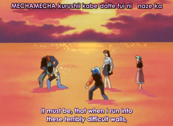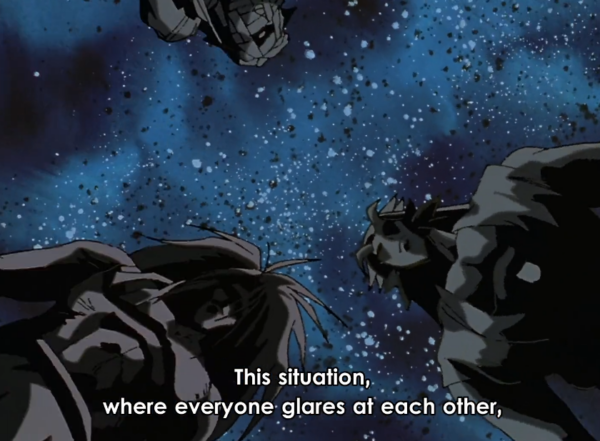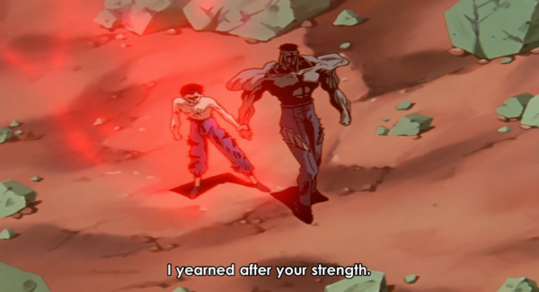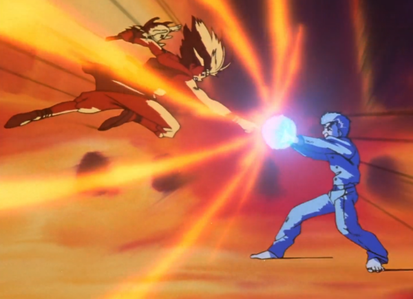 Animation wise, it’s par for the course with what was coming out in the 90s. What sets this anime apart, though, is the constant use of colors to convey tone. Whether it tinting the whole screen blue in a desperate moment or during some of the big fights using heavy contrasting colors. I loved the use of that. And then there are some random moments where the animation gets really fluid and good. There’s a particular fight early in the Chapter Black saga that took me back for a moment with that animation change.