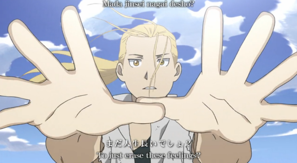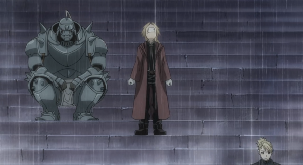 The animation is really good with moments of being absolutely amazing. Bones did amazing. The real star of this section is not only the beautiful soundtrack but the sound effects. I could listen to the sounds of transmutation in this show all day. That sound effect is amazing. The soundtrack is great. The first and last openings are easily my favorite. But rewatching this I realized the best song in this series is easily the second outro “Let it all out.” The song by itself is a really beautiful and somber mid-tempo track, but the way it’s used multiple times as a transition from a super emotional scene at the end of the episode was nothing shy of great. It enhanced both the song and the moment.