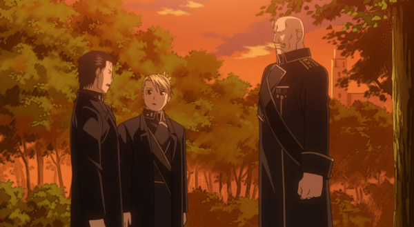Edward & Alphonse are a great duo. They manage to be light-hearted and somewhat cheerful while also having their eyes on their goal and never forgetting their mistakes. Their bond not only between each other but with Winry and everyone else they know and encounter throughout the story is amazing. Their resolve to reach their goals while also not forgetting for even a second the things they’ve sacrificed and the people they weren’t able to save was admirable. In lesser written series stuff like that could come off as grating but it works really well here. It’s easy to forget that they’re just kids undertaking all this with the way that they carry themselves and the burdens of their sins. Their character moments are some of the highlights of the entire show. Whether it be Alphonse’s self-doubt about his situation and how he overcomes that or Ewards’s deep guilt and issues with his father. There’s a large maturity in their characters yet they still retain their youth. It works really well and they carry the story excellently.